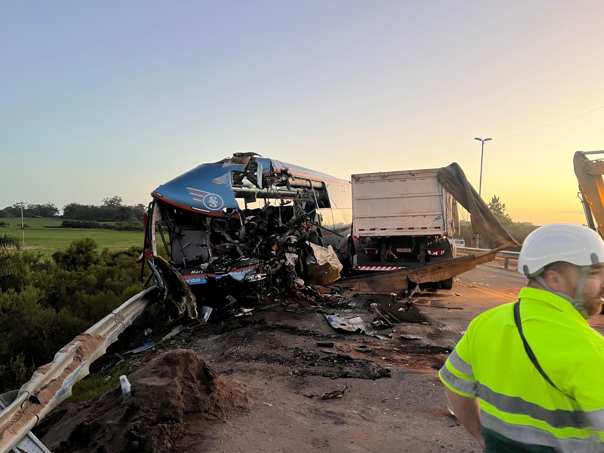 O caminhão carregava areia, parte da qual invadiu o ônibus, dificultando o resgate.