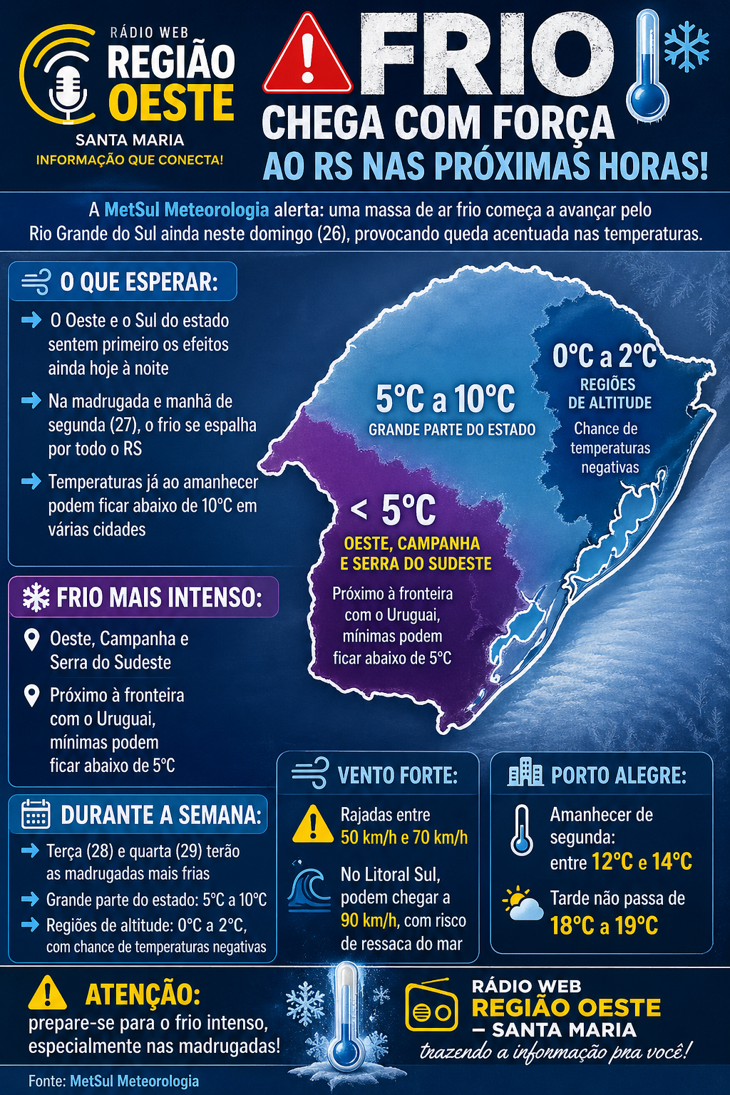 A MetSul Meteorologia alerta: uma massa de ar frio começa a avançar pelo Rio Grande do Sul ainda neste domingo (26), provocando queda acentuada nas temperaturas.